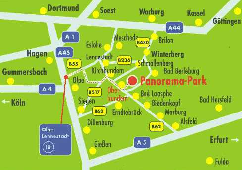 Anfahrtsbeschreibung Sie können auch eine Karte vom Park haben oder eine druckbare Version dieser Karte. Über die A45, Abfahrt 18 (Olpe/Lennestadt). Über die B55, den Schildern folgen. Panorama-Park D-57399 Kirchhundem-Oberhundem Info-Telefon: 02723-774-100