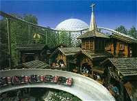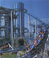 Im modernen blau gehalten ist das neue Wahrzeichen des Parks: Die Euro-Mir Achterbahn. 28 Meter Höhe erreicht die Bahn. Und kurz darauf 80 km/h. Das wirklich fiese ist aber, daß die Gondel sich dreht, man also nicht immer in Fahrtrichtung sitzt. Nichts für schwache Mägen.